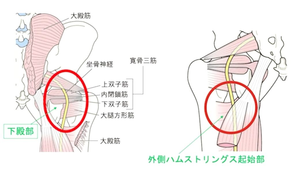 太ももの裏側にあるハムストリング筋肉群の付着部付近で、坐骨神経が圧迫されることがあります。特に坐骨結節(座った時に椅子に当たる骨)周辺で神経が絞扼されやすい部位です。