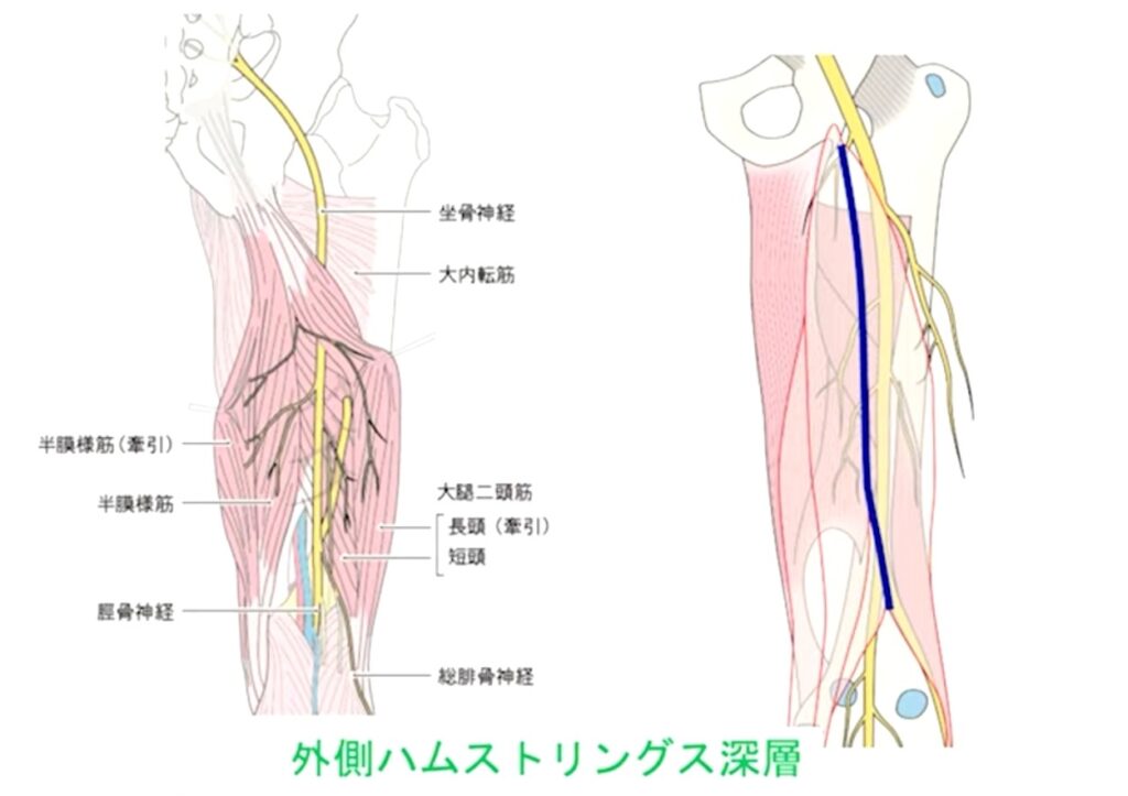 ハムストリング筋肉の深い層を坐骨神経が走行しています。筋肉の柔軟性が低下したり、筋膜の癒着が起きたりすると、この部分で神経が締め付けられます。