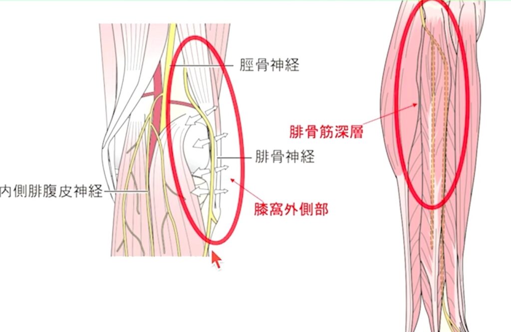 **膝の裏側(膝窩)**では、膝窩の脂肪体や腓腹筋(ふくらはぎの筋肉)の起始部で神経が圧迫されることがあります。ふくらはぎの痛みやしびれが強い方は、この部分の評価が重要です。