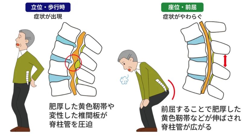 これは、歩行中に神経への圧迫が強まり、休憩や前かがみ姿勢で圧迫が一時的に軽減されるために起こります。